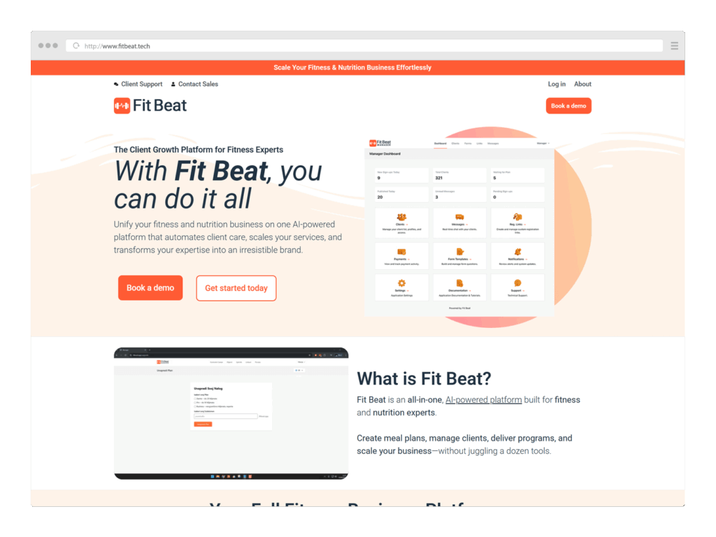 Fit Beat je kompletno SaaS rešenje namenjeno trenerima i nutricionistima koji žele da digitalizuju i automatizuju svoj posao. Platforma omogućava kreiranje i praćenje planova ishrane i treninga, komunikaciju sa klijentima i upravljanje pretplatama — sve kroz jednostavan i intuitivan interfejs.