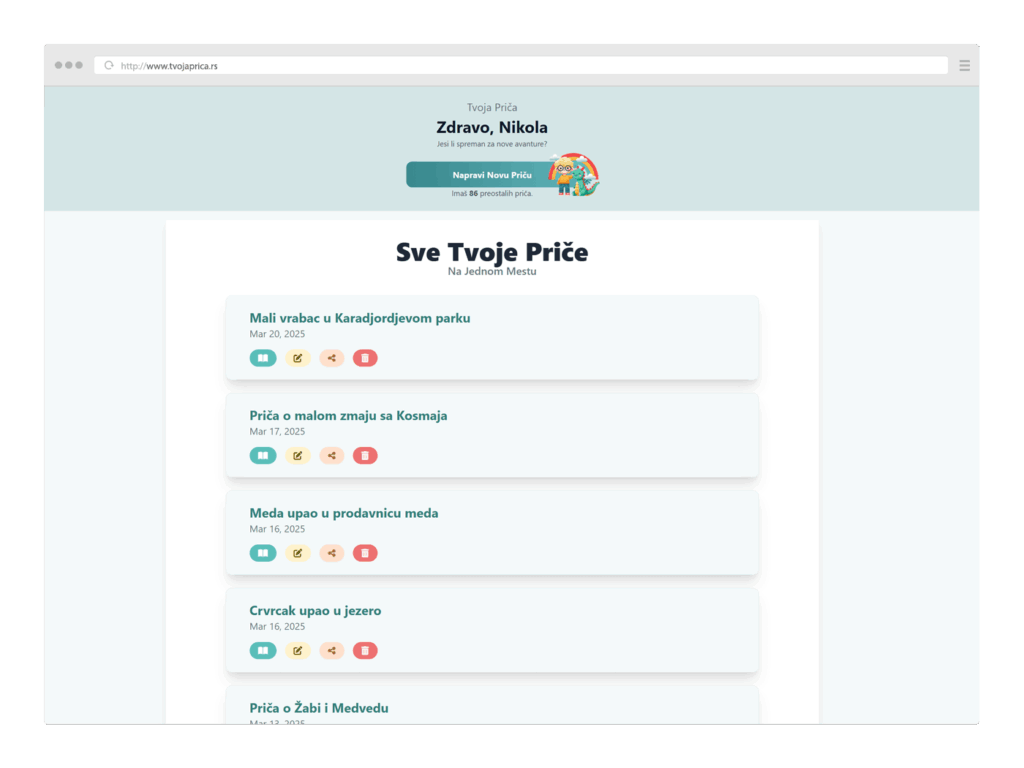 Rezultat:Platforma je omogućila stotinama roditelja da svakodnevno kreiraju personalizovane i edukativne priče za svoju decu, čime je spojila AI tehnologiju i dečiju imaginaciju u jedinstveno digitalno iskustvo.