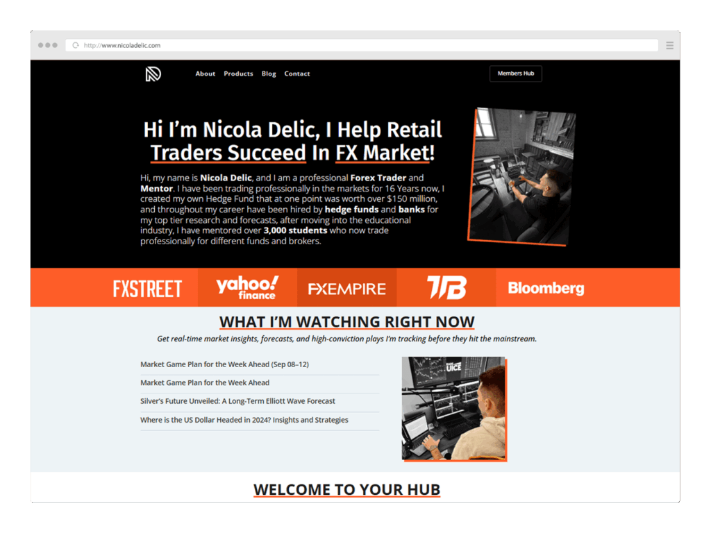 Kompletan rebranding i redizajn veb sajta za poznatog finansijskog analitičara i mentora. Projekat je uključivao modernizaciju brenda, UX/UI optimizaciju i izradu membership platforme namenjene klijentima koji prate edukativne programe i trading kurseve.