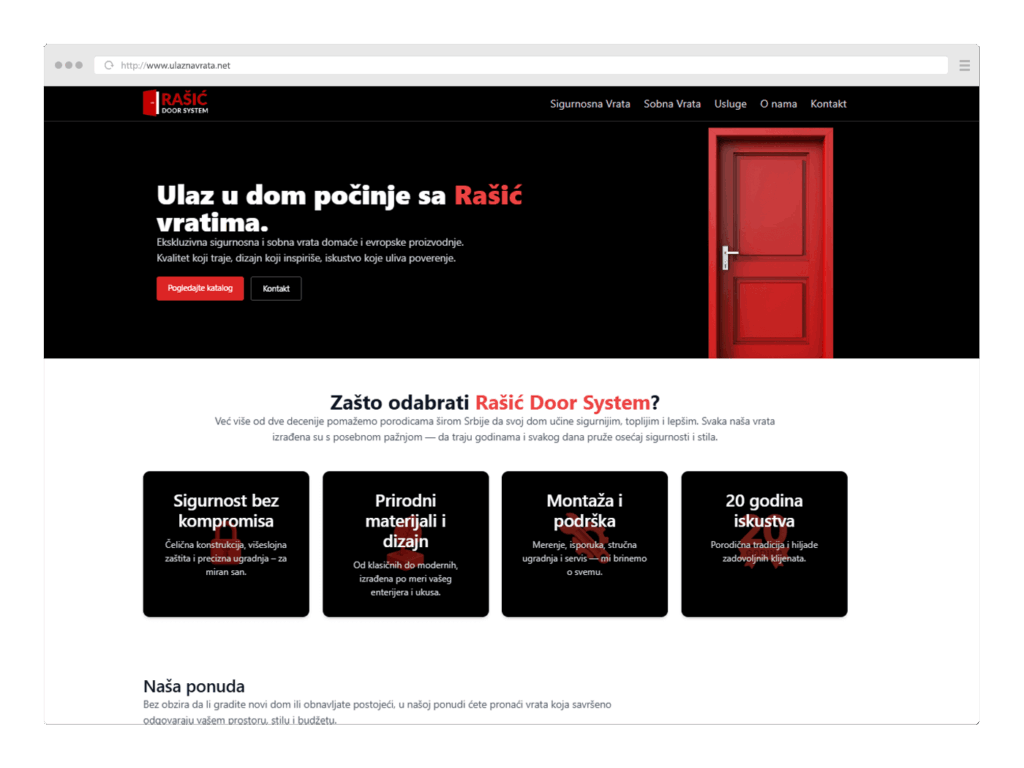 Kompletan redizajn postojećeg sajta za kompaniju koja se bavi prodajom sigurnosnih i sobnih vrata. Cilj je bio modernizovati izgled, poboljšati korisničko iskustvo i izgraditi potpuno funkcionalan prodajni katalog koji klijent može lako održavati.